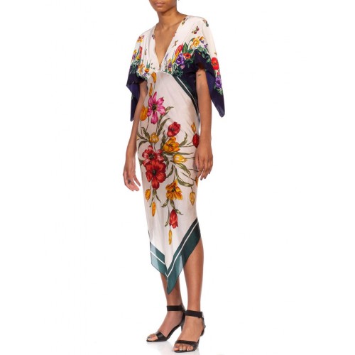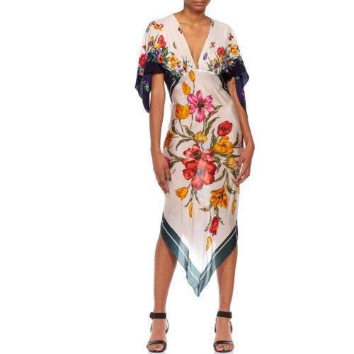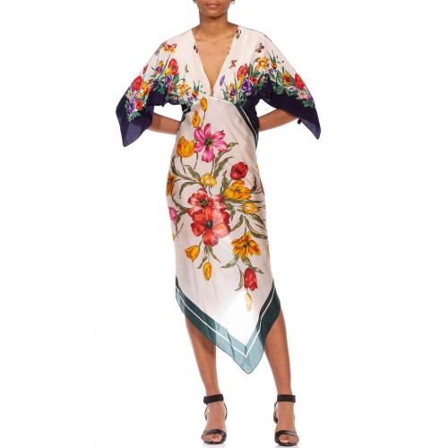 1MORPHEW COLLECTION White Multicolored Silk Botanical Print With Borders Scarf Dress