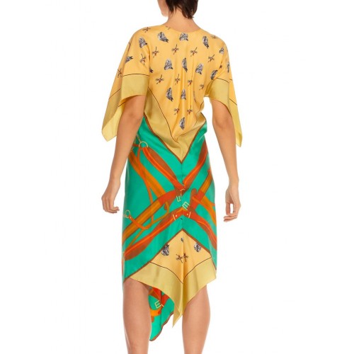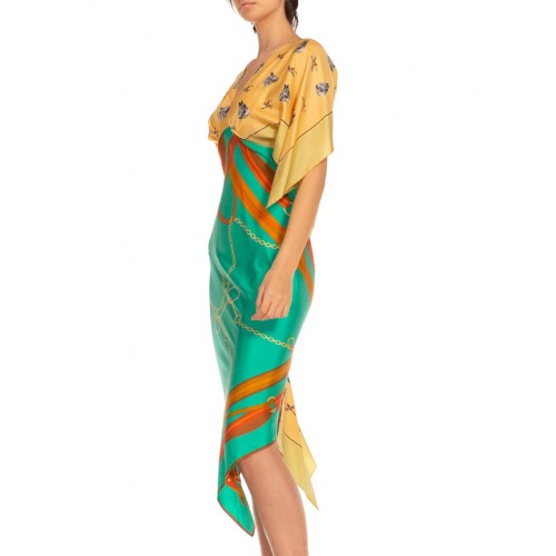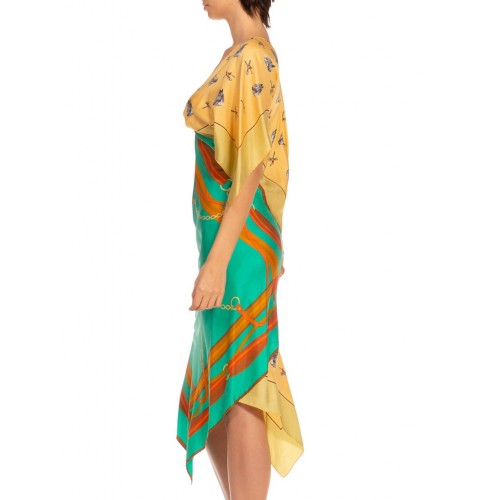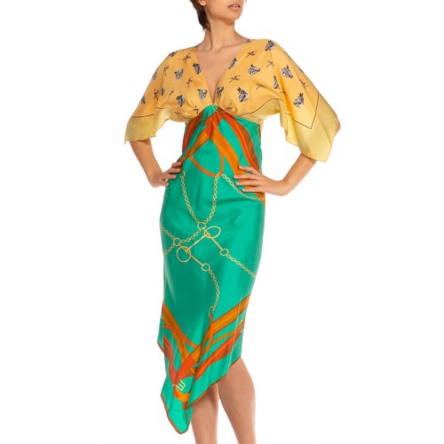 1MORPHEW COLLECTION Butter Yellow & Teal Status Print Silk Two Scarf Equestrian Dress