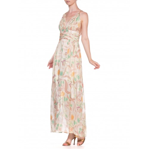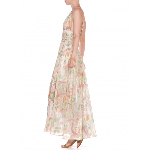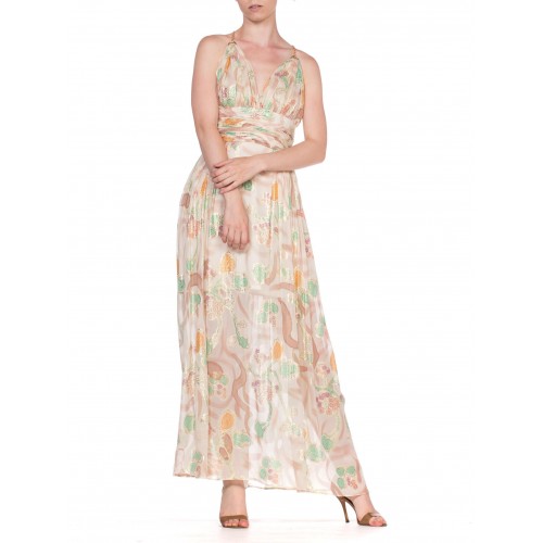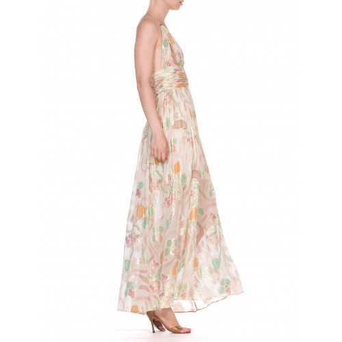 1MORPHEW ATELIER Hand Painted Silk Lurex Fil Coupé Chiffon Gown With Gold Chain Straps