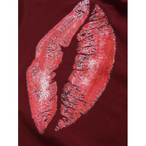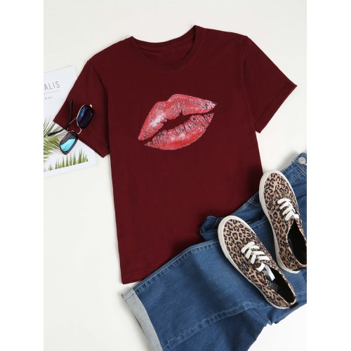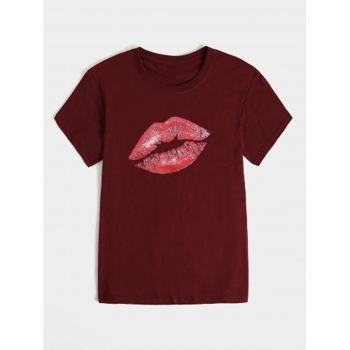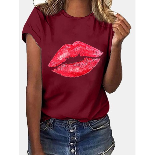 Women Casual Crew Neck Lips Print Short Sleeve Basic Tee T shirts
