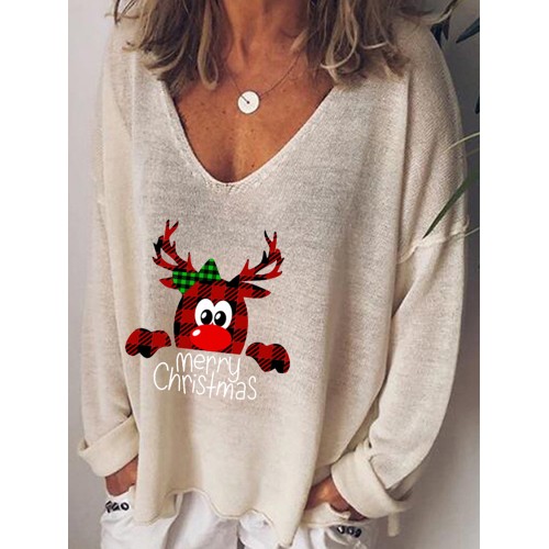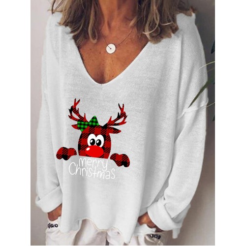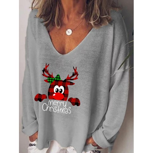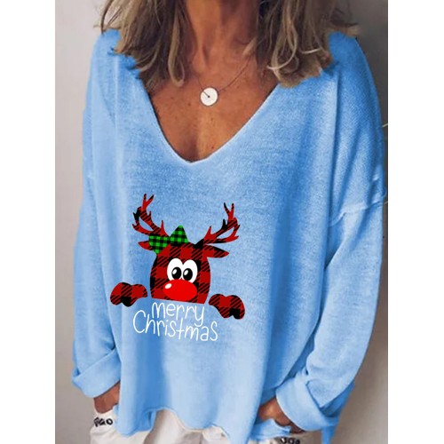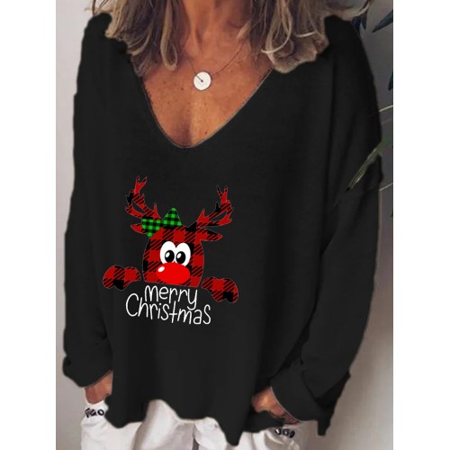 Women Christmas Letter Cartoon Print V Neck Loose Long Sleeve T Shirts