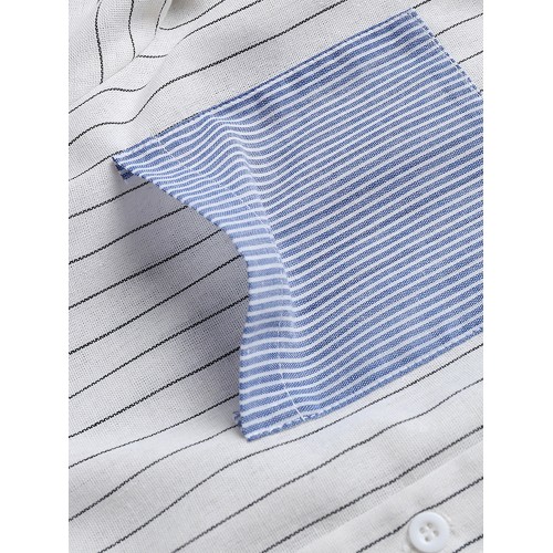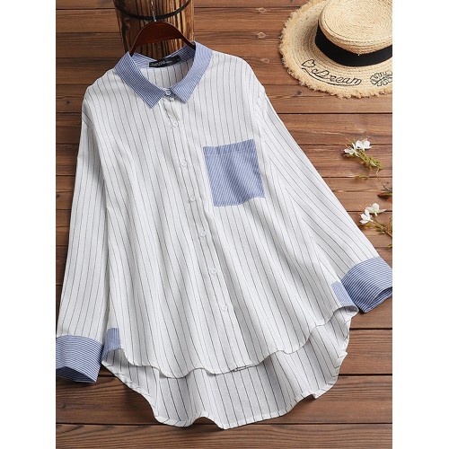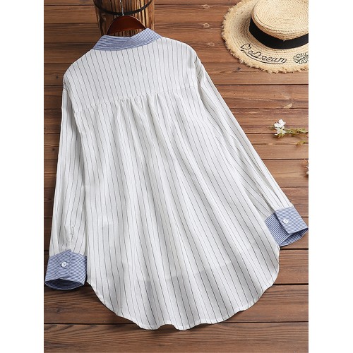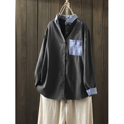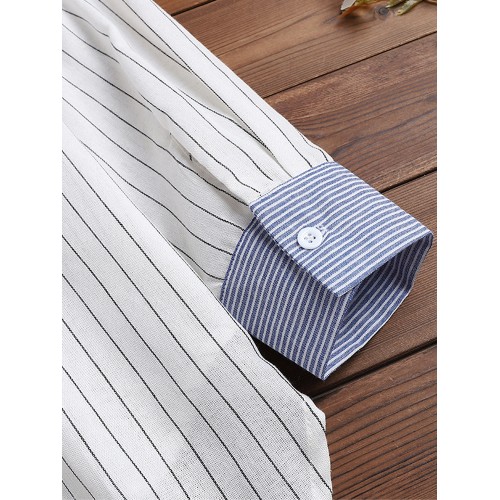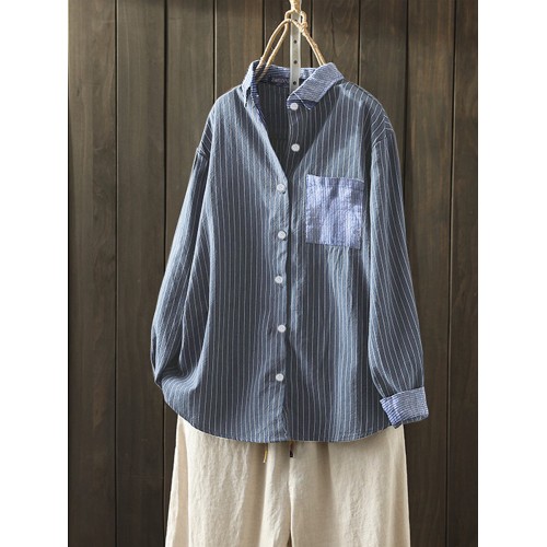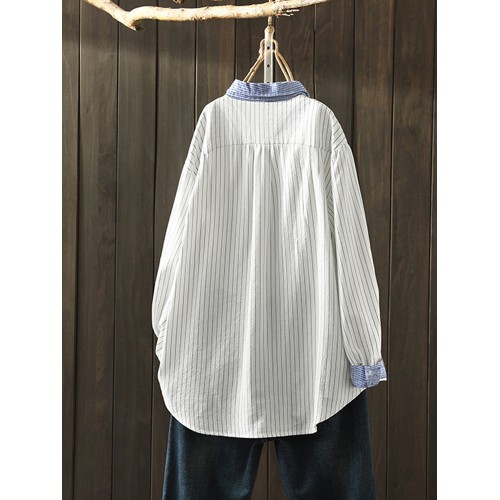 Women Cotton Stripe Print Patchwork Simple Daily Casual Shirts
